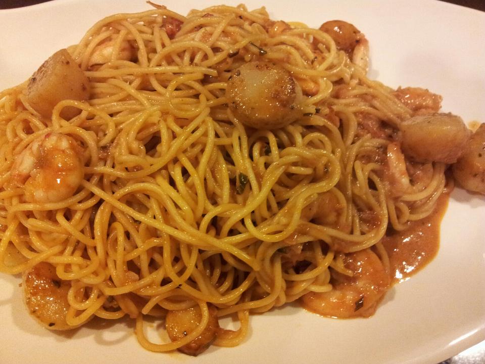 - Cook the dish – stir-fry the prawns (shelled) in olive oil first to almost cooked. cook the spaghetti in the usual way following the timing instructions. heat up the pink sauce, add the prawns & drained crabmeat, cook for few minutes, then turn off the fire, add the spaghetti & toss, and then add the seared scallop, and serve.