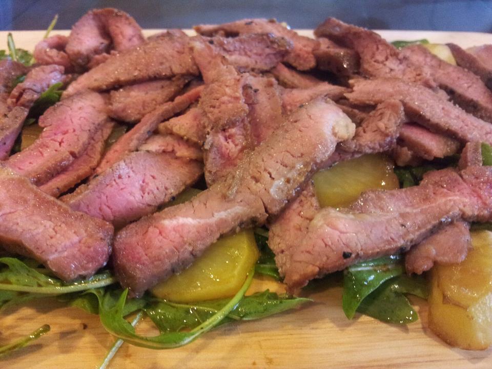 tagliata di manzo (Italian sliced beef) using chuck tender as mock fillet mignon with rockets, cherry tomatoes & roast potatoes