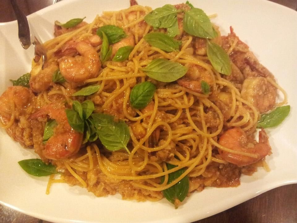 A more interesting experiment is with the chilli crab pasta. I found a chilli crab sauce recipe & substituted the crab with prawn shell stock – the crab or prawn or shellfish flavour is needed to make the sauce taste genuine like real chilli crab sauce. This turned out very well indeed at the first attempt & by the time of the dinner I had 2 previous successful tries.