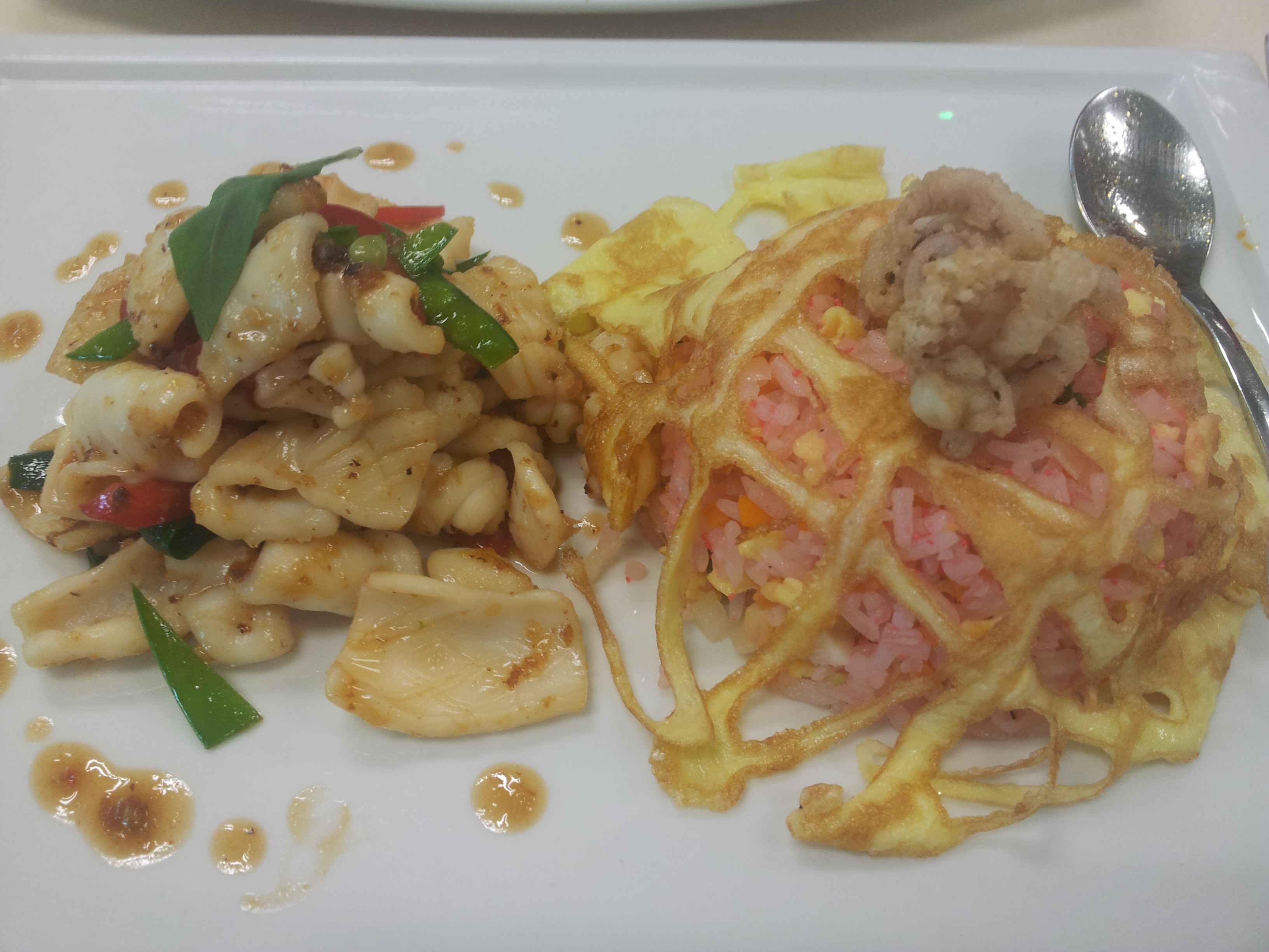 the basil squid was good…rice too with nice egg netting decoration. 🙂