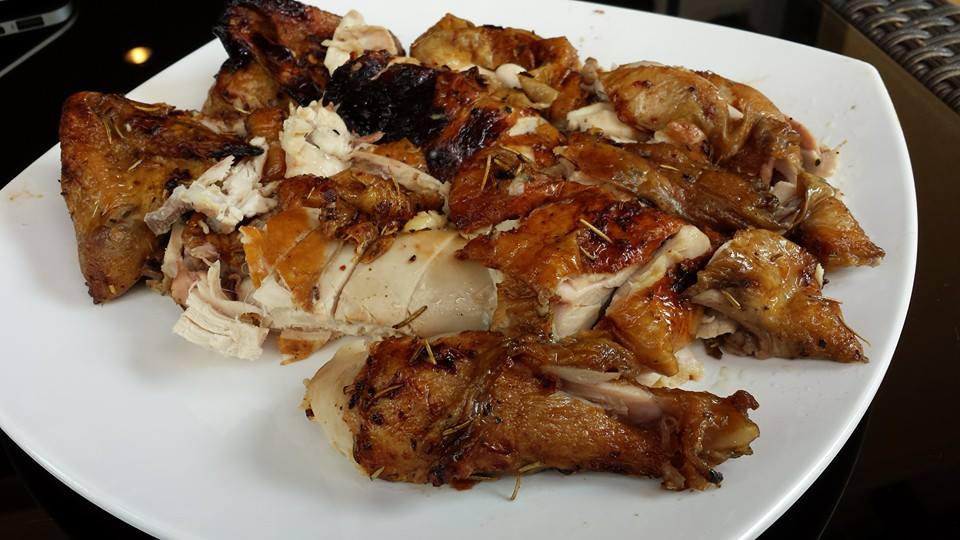- Cook the chicken – insert the rub of sliced garlic & rosemary under the chicken skin on both breast side & back. rub 1 tbsp olive oil over skin to make it crispy,open a can of beer & drink or remove 1/2 of its content. insert the 1/2 filled beer can into the lower cavity of the chicken. place the chicken standing upright on the beer can on an aluminium foil-lined baking tray & cook 15mins at 175degC + 25mins in 250degC in a preheated oven. remove from oven & let the chicken rests, and then debone or carve & serve.