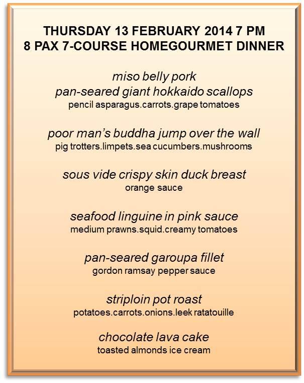 menu planning – i was looking for a change of menu for my RI buddies dinner from the usual miso cod & pan-fried wagyu as main courses. i did a good gordon ramsay crispy salmon so i knew i would do ok with garoupa fillet. it was not convenient to practice the gordon ramsay pepper sauce nor the pot roast but i felt quite comfortable to do it for the first time for my friends. 🙂 the poor man’s buddha-jump-over-the-wall was also a new dish. i did it once & it was good. for the pasta, i thought to revisit my seafood pink sauce linguine (& i did a very good one recently) to replace my usual alio olio. 🙂
