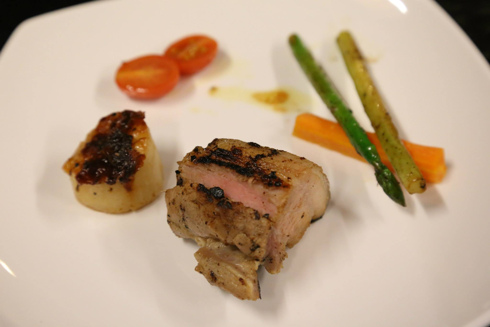 scallop. miso belly pork. pencil asparagus. grape tomato. carrot.