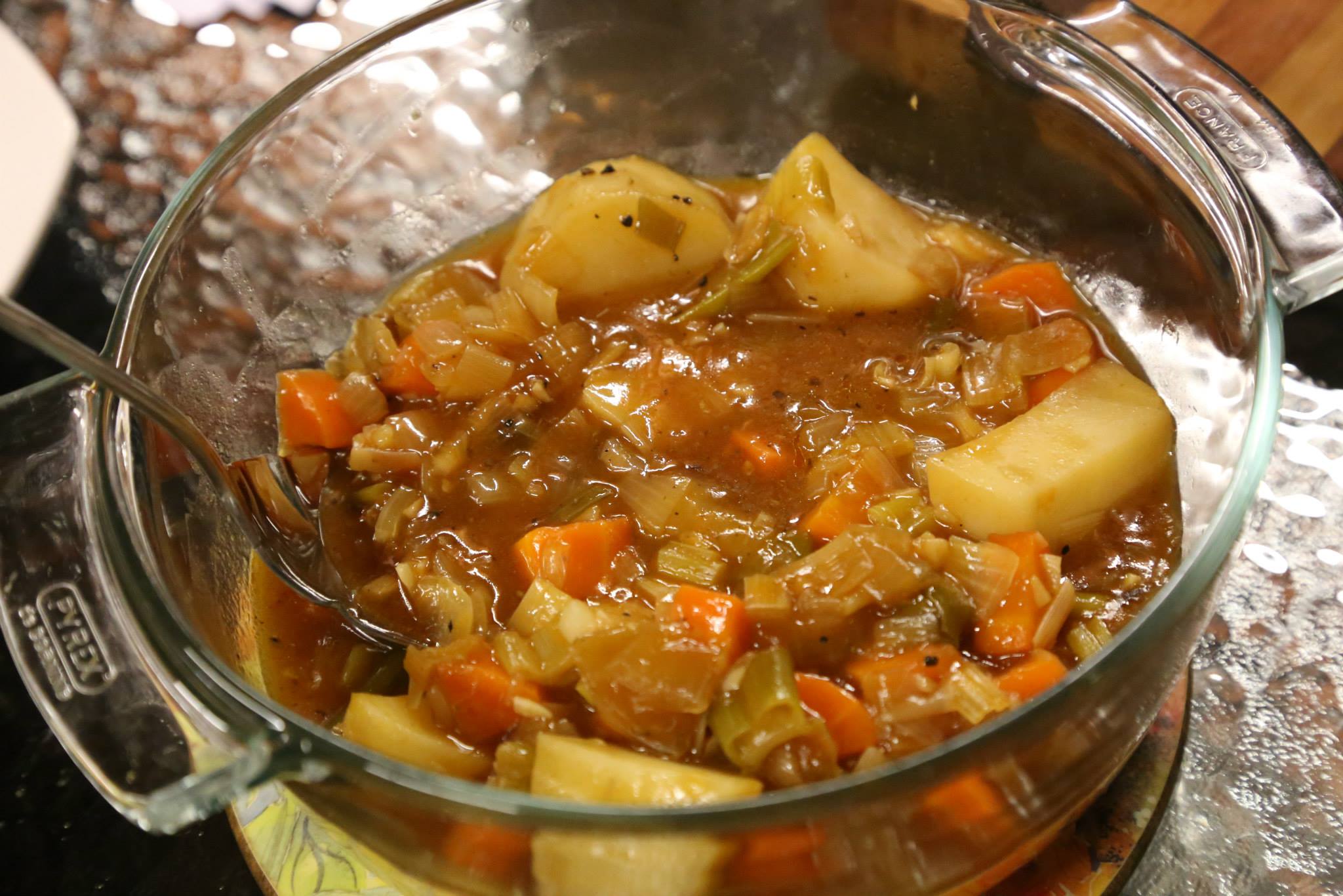 #6 the striploin pot roast was a beauty. see the nice maillard reaction brown ring in the photo. it was nicely seared all round before placing in a crockpot on low with the vegetable ratatouille to reach 125degF (52degC) – about 1.5hrs, then in a 55degC oven for another 1 hr. it was a very nice medium rare, & medium at the ends. i was very pleased with this first crockpot roast on a striploin. my first was a chuck pot roast. it was good but this was lots better! 🙂