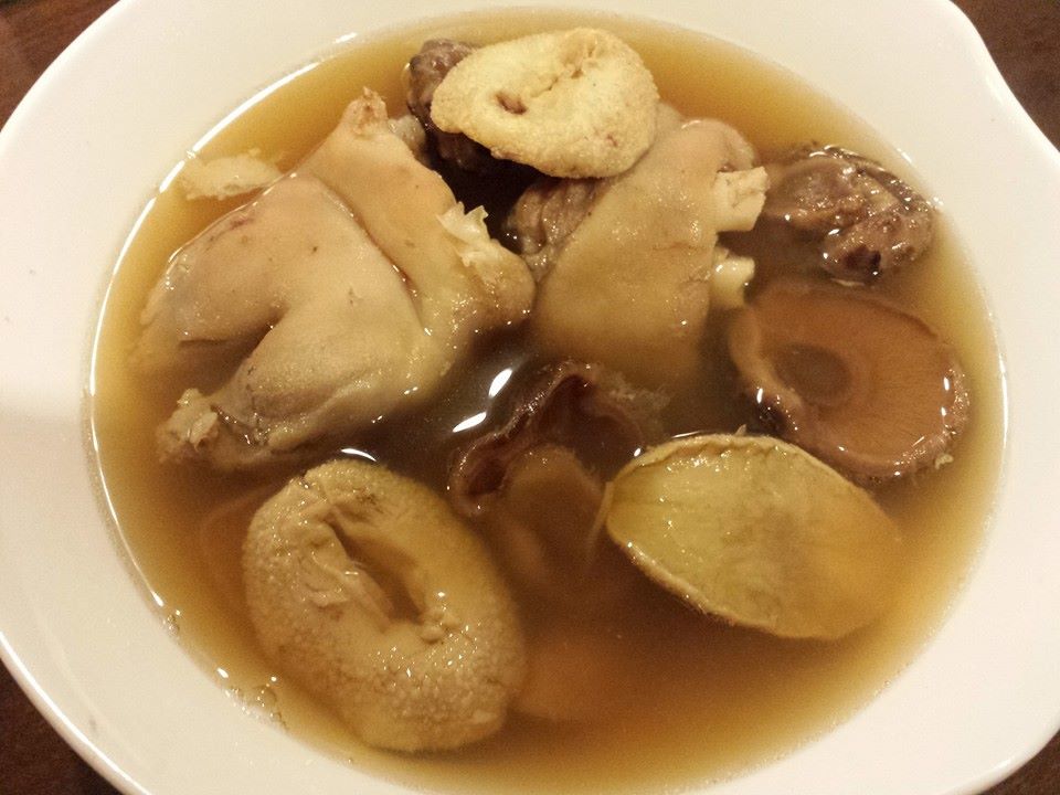 - add boiling water to some dried mushrooms & 2 dried scallops & soak for several hours to soften. add the remaining boiling water to pig trotters to remove scums, then clean thoroughly in slow running cold water. clean & cut out 2 chicken quarters. place the 2 chicken quarters & pig trotters (4 large pieces) in a crockpot & add the dried scallops, mushrooms & also the water they were soaked in, throwing away the residue. add some water & 1 teaspoon of salt. open a can of small abalones (or limpets) & empty contents into the crockpot.