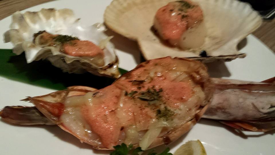 japanese shellfish grilled in shells not my favourite preparation. for me, oysters should be taken raw, though occasionally breaded oysters can be quite nice, and scallops pan-fried. however, all these looked grilled (& maybe flamed) & may in fact have been grilled with mentaiko then plated on the shells. if so they should be quite tasty & flavourful.