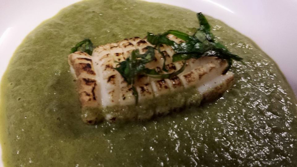 for the sauce, again i used lots of vegetable to make it so tasty. i fried in butter 1/2 onion, 1/2 stalk leek, 1 green pepper & a bunch of spinach leafs. then i placed them in a blender & added 2 tablespoon extra virgin olive oil & salt & pepper to taste. such a wonderful sauce complementing the flamed squid.