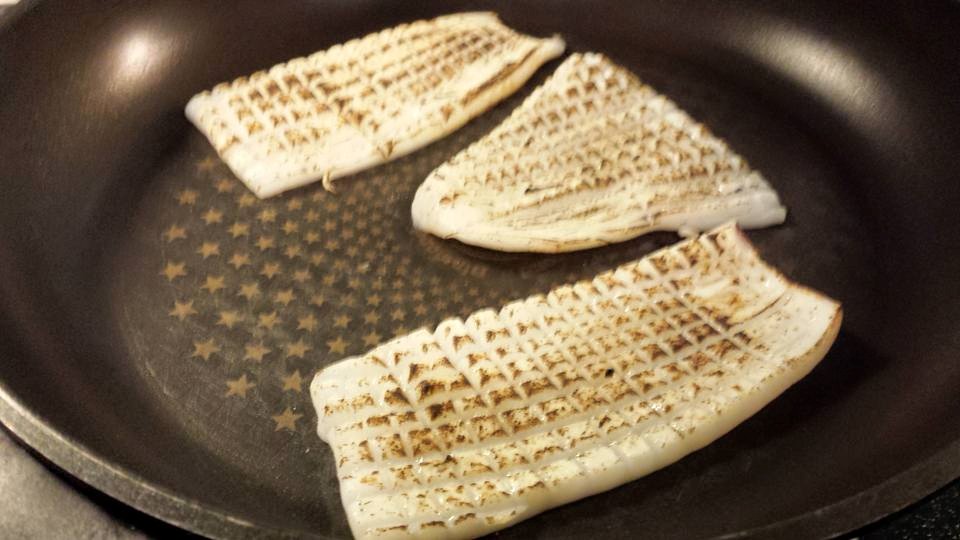 i cross cut (very closely) a large squid into 4 pieces (about 9cmx6cm), placed them on a pan & torched. i knew that’s was not enough to cook the squid, so fried them in butter afterwards.