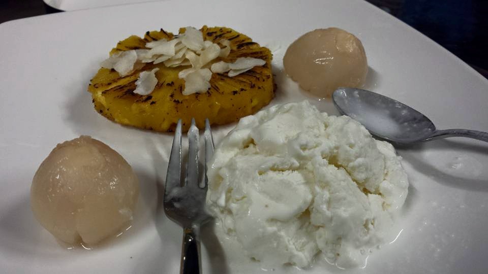 my wife ordered the tipsy cake. according to the server this was the most difficult dessert to make as the pastor chef had to manage the temperature & to add liquor to the brioche at specified intervals. the roasted pineapples was the easy part.