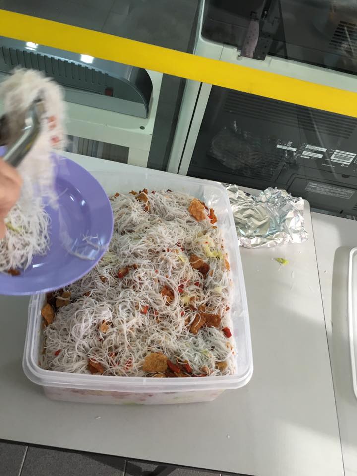 my friend was already there. the food, including fried beehoon & hum chee pen were on the table. the friendly centre staff helped to transfer the char siew & miso belly pork to serving aluminium trays & served the residents as they queued for the food.