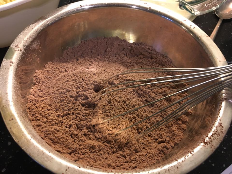 - sieve 1 & 3/4 cups plain flour (245g) & sieve 3/4 cup cocoa powder (75g) to a large bowl, add 7 tbsp sugar (105g), 1 & 1/2 tsp baking powder, 1 & 1/2 tsp baking soda, 1/2 tsp salt & mix. <recipe called for 400g sugar. i used just 5tbsp (75g) so i could adjust later. i tried the cake mix later & added 1 tbsp & then 1 more tbsp sugar so in total 7 tbsp (105g) sugar>