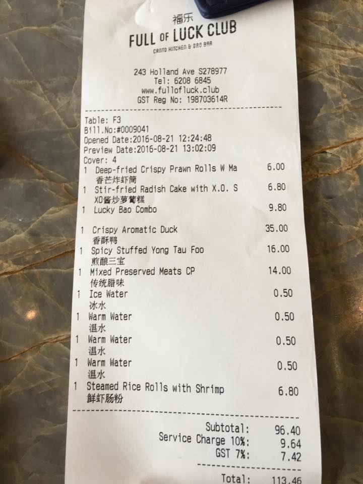 overall bill was S$138.50. there was no GST no service charge. with the groupon S$100 voucher costing S$49.90, dinner with 9 dishes for 7pax was about S$88.