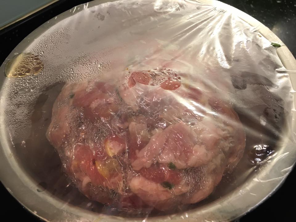 i scalded & cut about 1.3kg pork collar, & marinated 48hrs in a 1 degC chiller compartment. 🙂