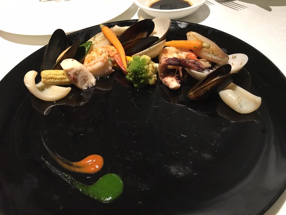 sotong (squid) only one tasted nice, good texture. poached octopus not great, tasteless (make me hesitate to order the separate poached & grilled octopus dish on appetizer menu), mussels & clams ordinary, nearly tasteless, and prawns, not even a nice bbq prawn flavour…