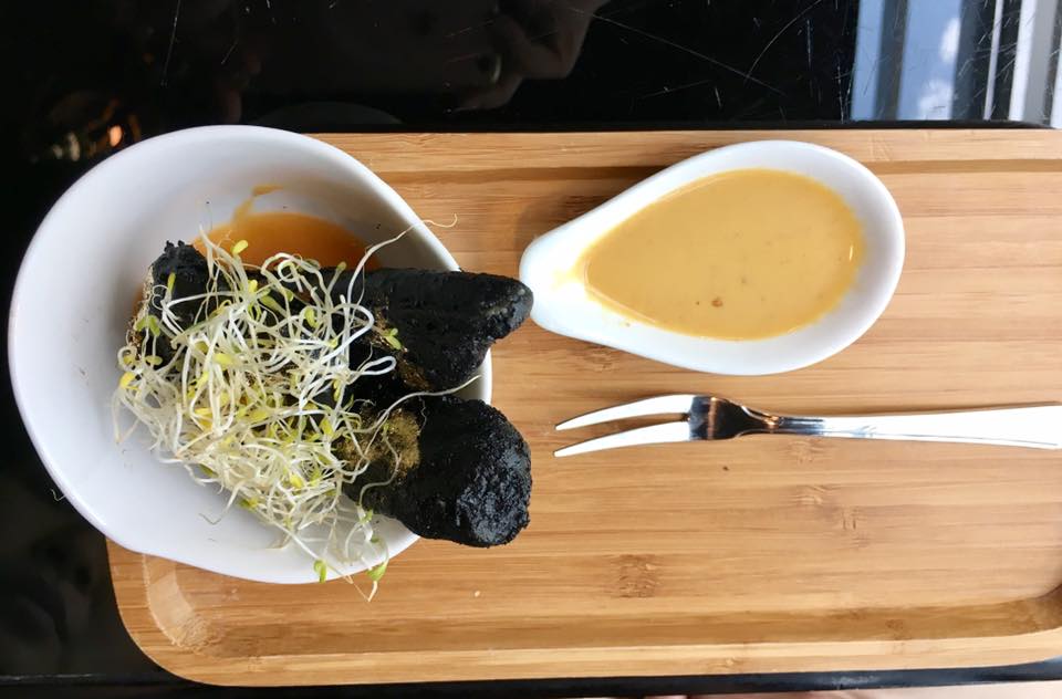 charcoal tempura – yam, eggplant, banana, apple with japanese goma dressing