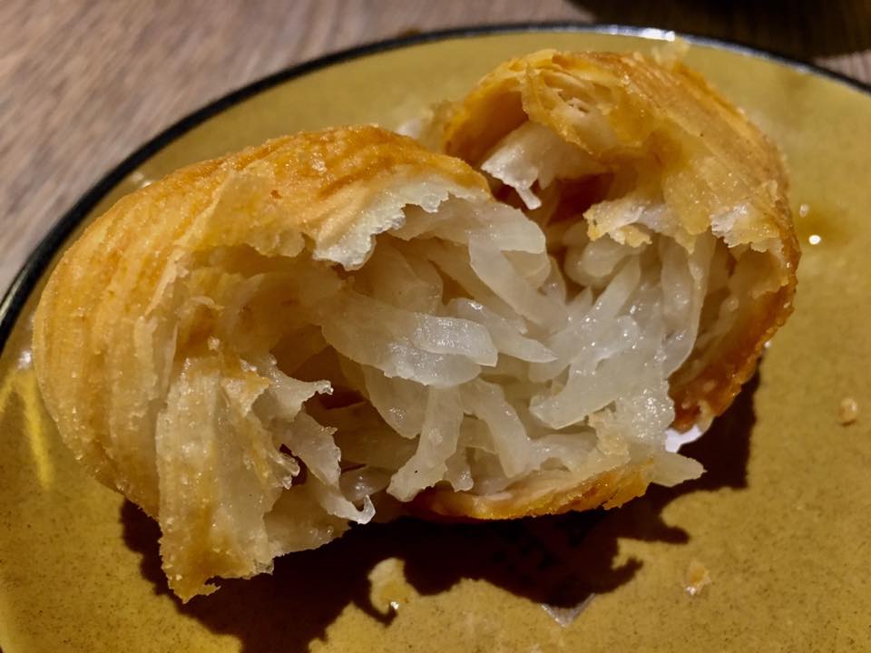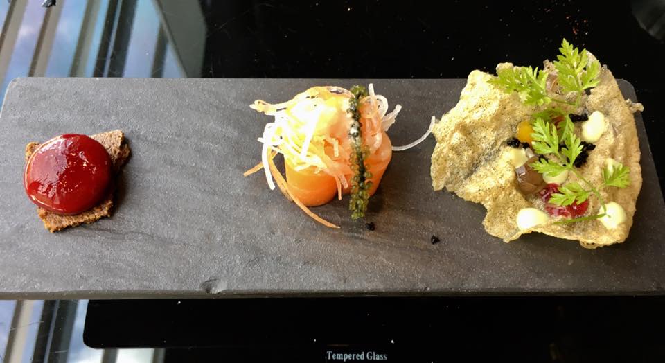 very nice indeed. the “cured salmon” centrepiece very interesting texture. wife thought it was like carrot juice with some gelatine, later confirmed by yan that it was konnyaku, which has gel properties. the cracker was nice & so was the raspberry thing which burst in your mouth!