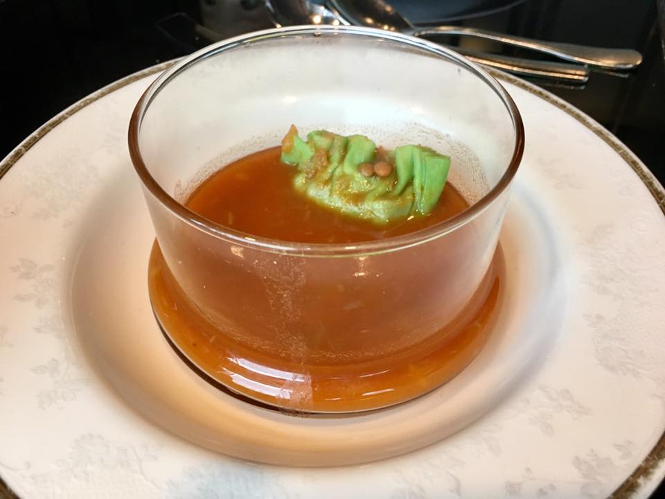 clear tomato soup with spinach dumpling