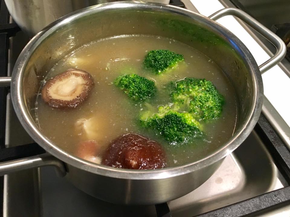 i did not have konbu & bonito flakes to make dashi. so i used chicken stock & mushrooms & lots of vegetables to sweeten the stock (carrots, radish, spinach stems, mushroom water).