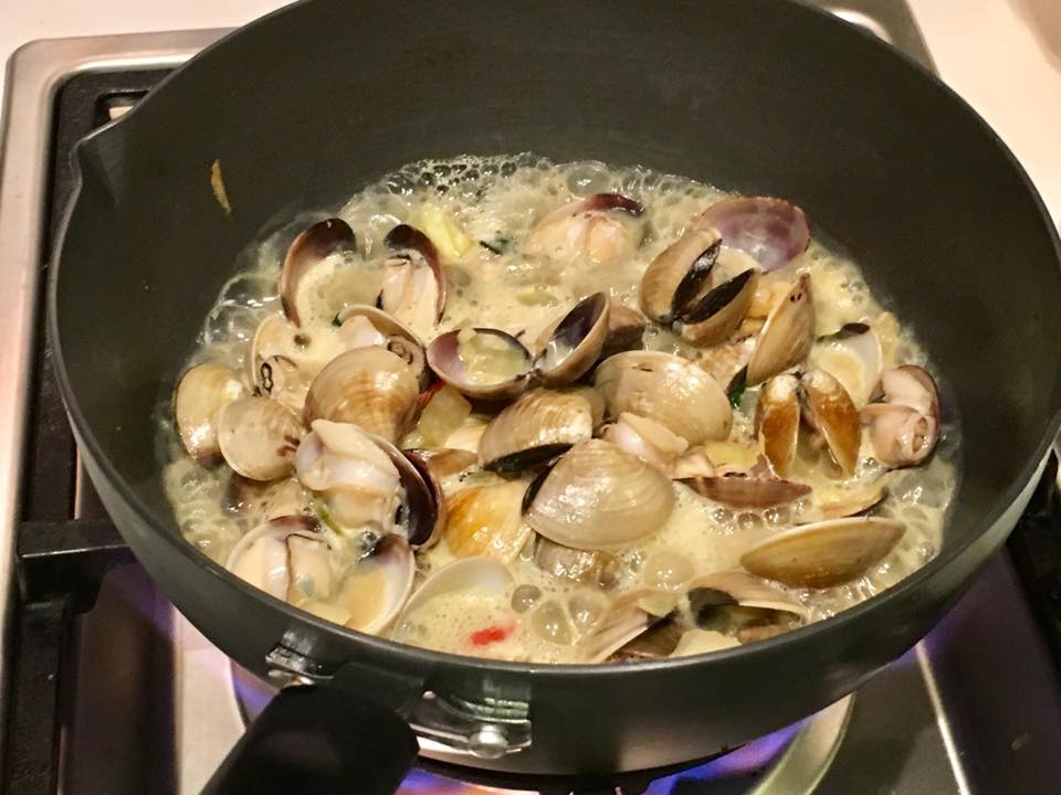 lastly i added in the clams, covered & waited few minutes for clams to open up ie cooked.