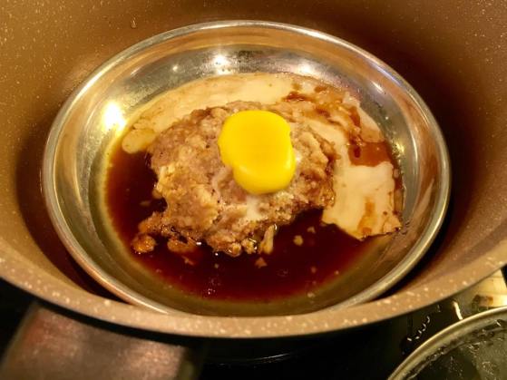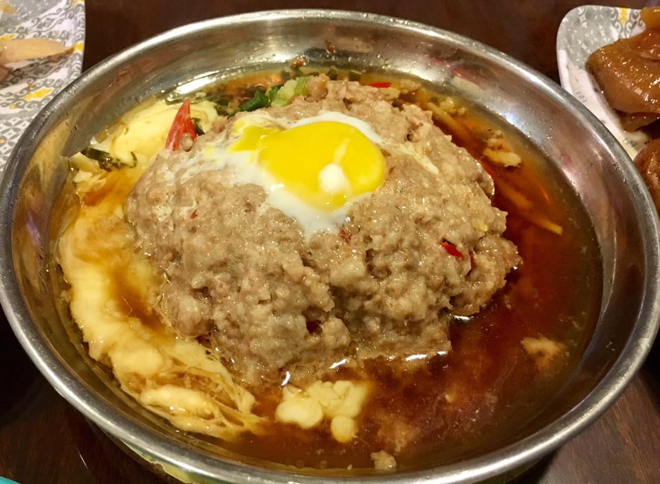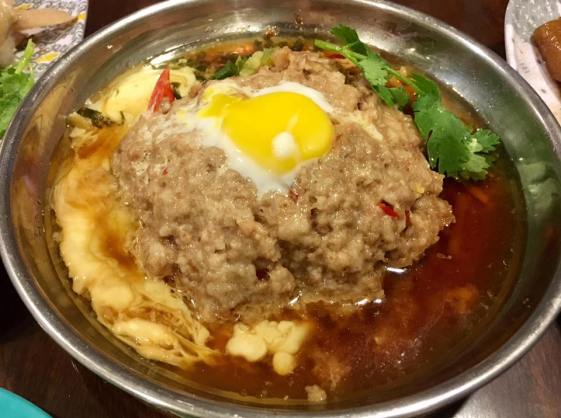 - make a depression on the minced pork(as in photo above) to hold the egg yolk. my opinion is the salted egg contribute little to the dish. so i replaced with fresh egg which is healthier but also contributed little to the dish except a nice volcano presentation, and i always like the silky egg yolk, no effort so no harm to have it.