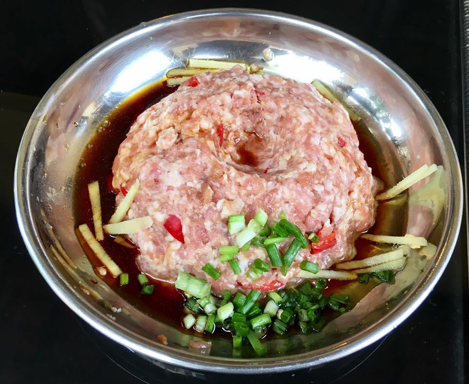 - add 1 tbsp light soy sauce, 1 tbsp olive oil & 1tbsp corn flour to minced pork & mix well