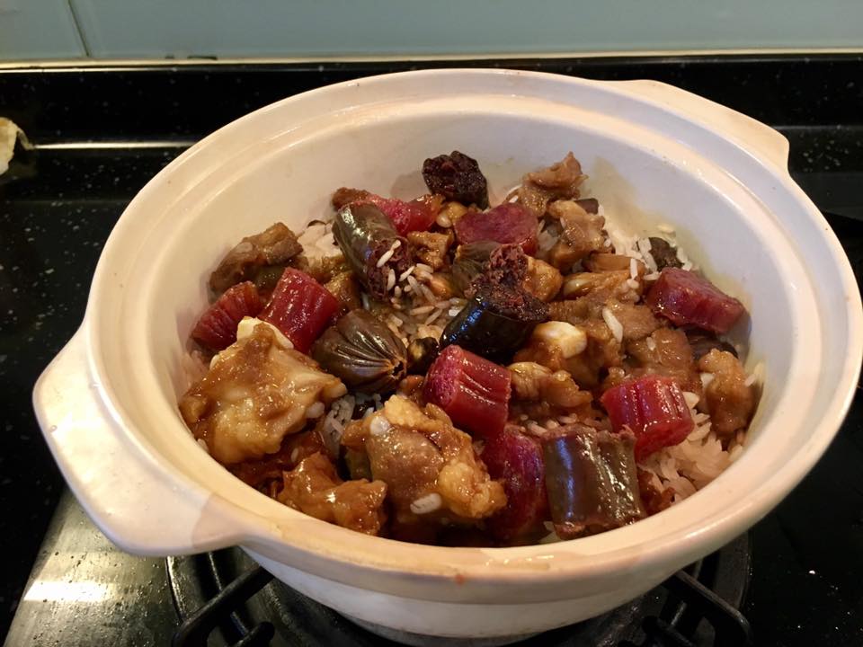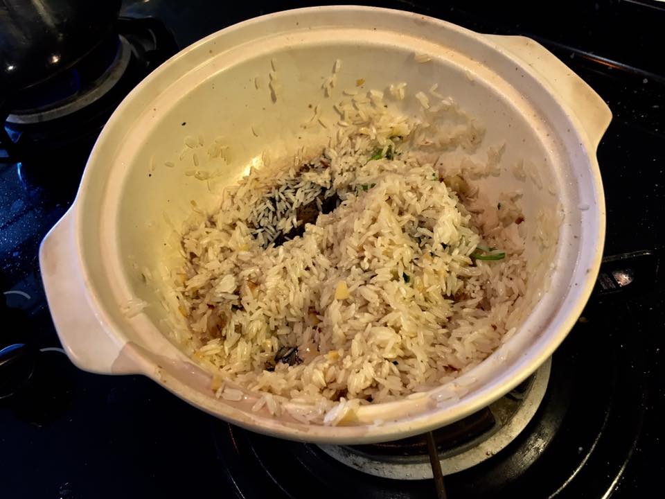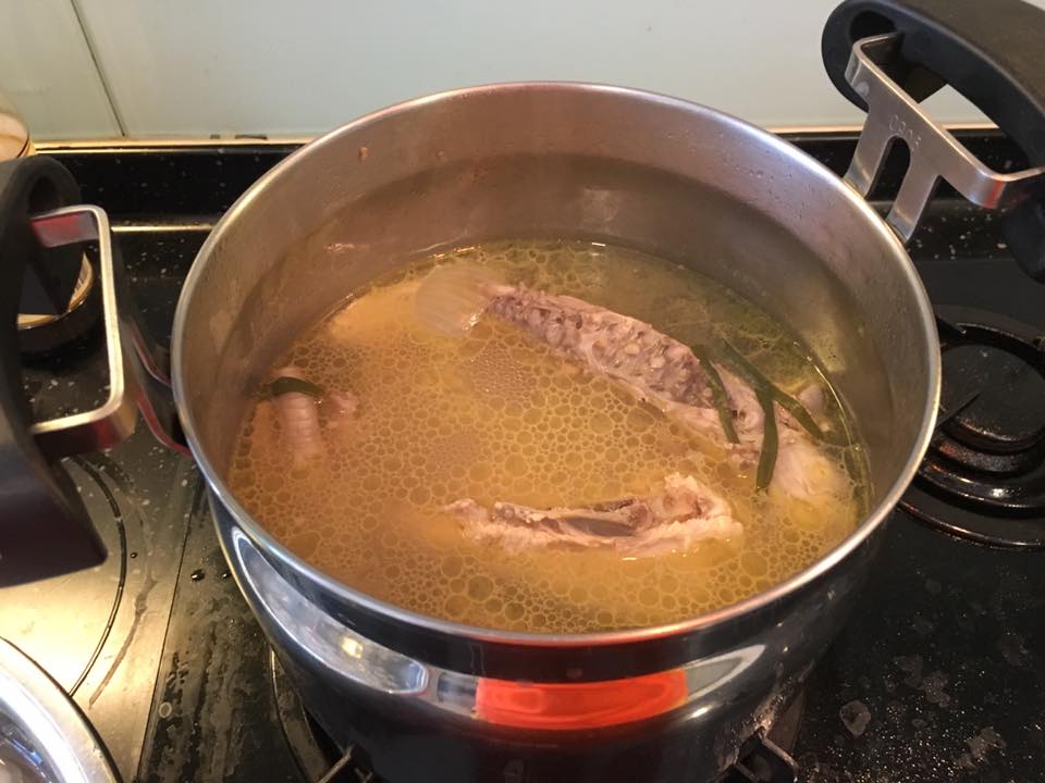 - add 1 bulb garlic cloves, red onions, spring onions, cut ginger to 1litre chicken stock in a deep ducth oven & bring to boil