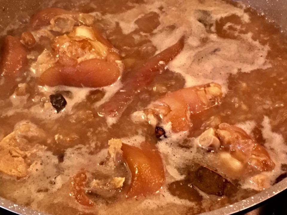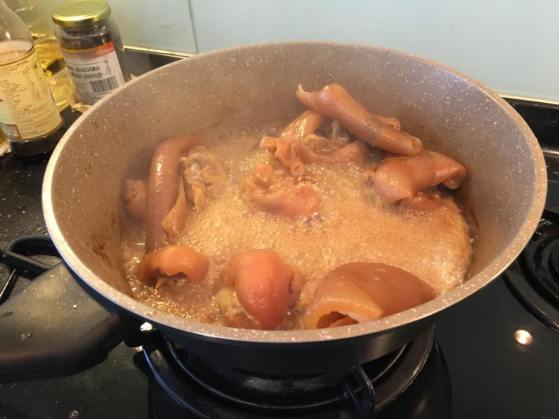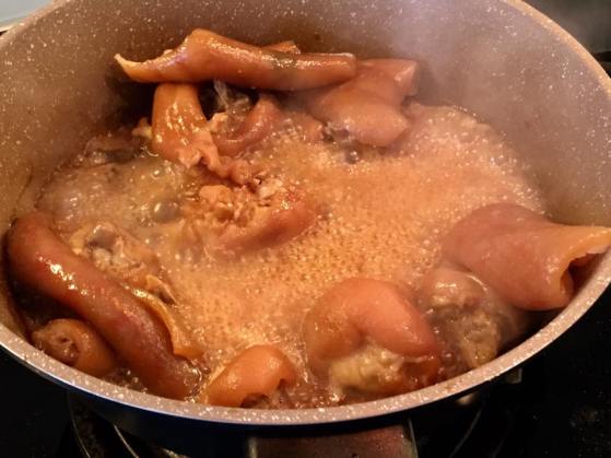 - fill with water to cover the trotters & let it braise & slowly reduce to a thicker sauce, adding water as required.
