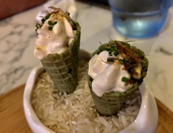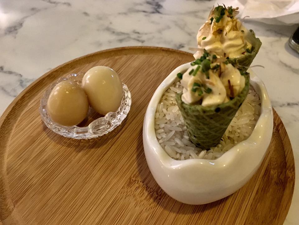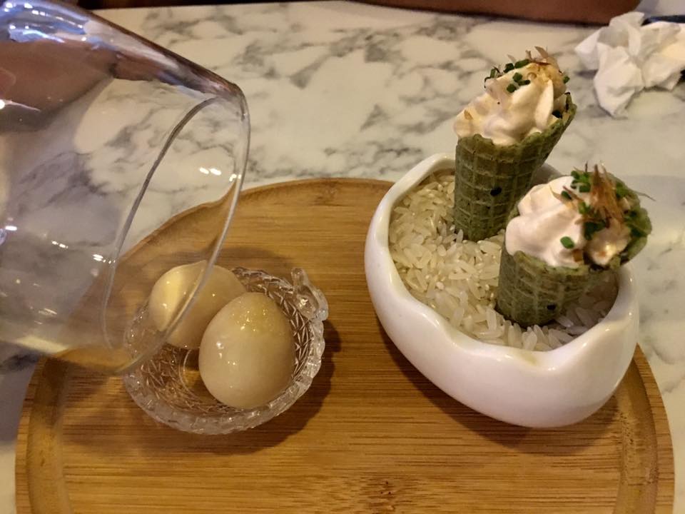 deviled eggs were a smoked quail egg & yoke mouse pesto cone.