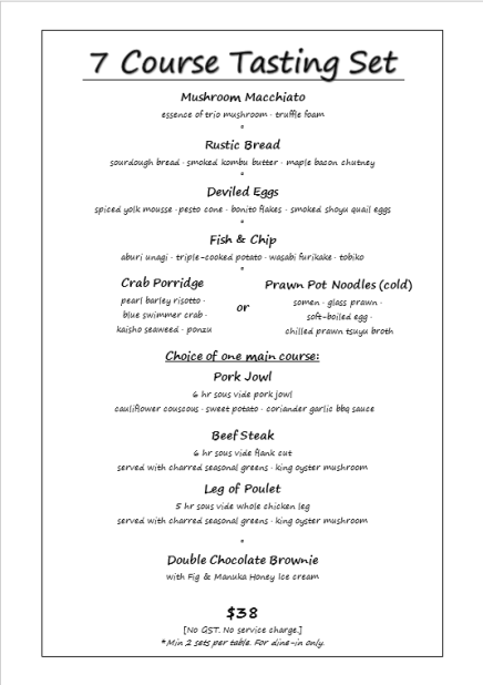 still, the ala carte price is very decent too, so I would just take ala carte dishes like mushroom macchiato, fish & chips, crab porridge (prawn noodles ok too) & a main, maybe the pork jowl..or maybe the flank steak ok don’t really mind it but no need to have…or just skip the main…ok to pay for the S$6.50 sour dough too..