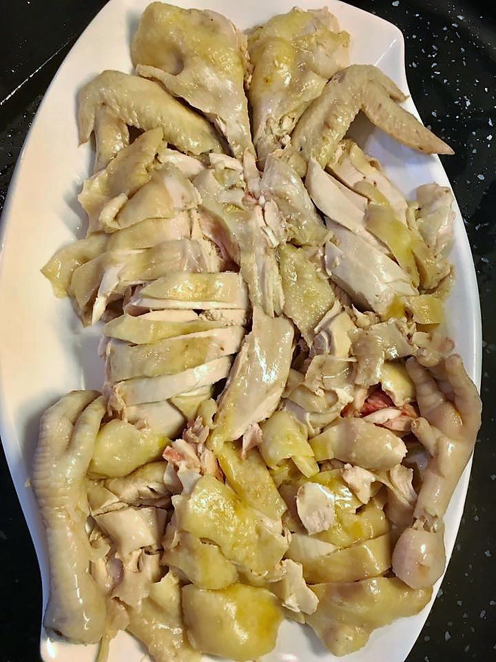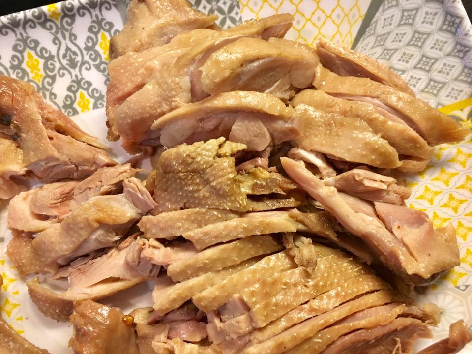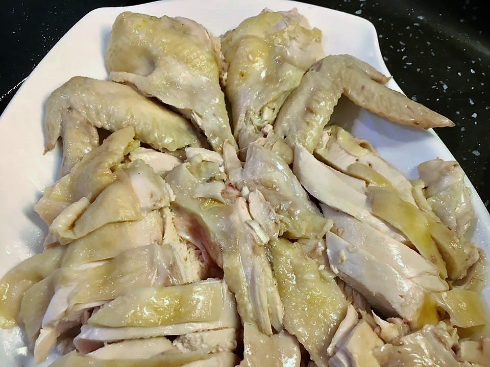 i cooked the chicken just right – 12mins simmering, 25mins off fire poached, then ice bucket, and placed in fridge.