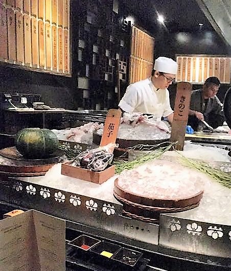 robatayaki is grilling over an open hearth. the counter is far from the chef so they serve the food in a huge oar at the traditional places.