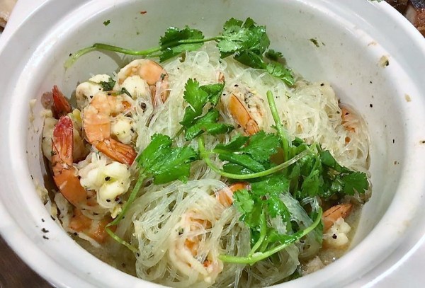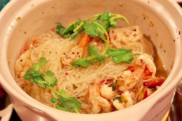 when serving boiled the stock, added in 3 rools of tanhoon, off fire, added back the prawns, tossed thoroughly, garnished with coriander & bring to table covered. voila!