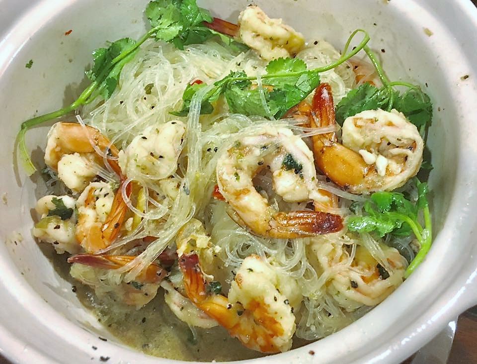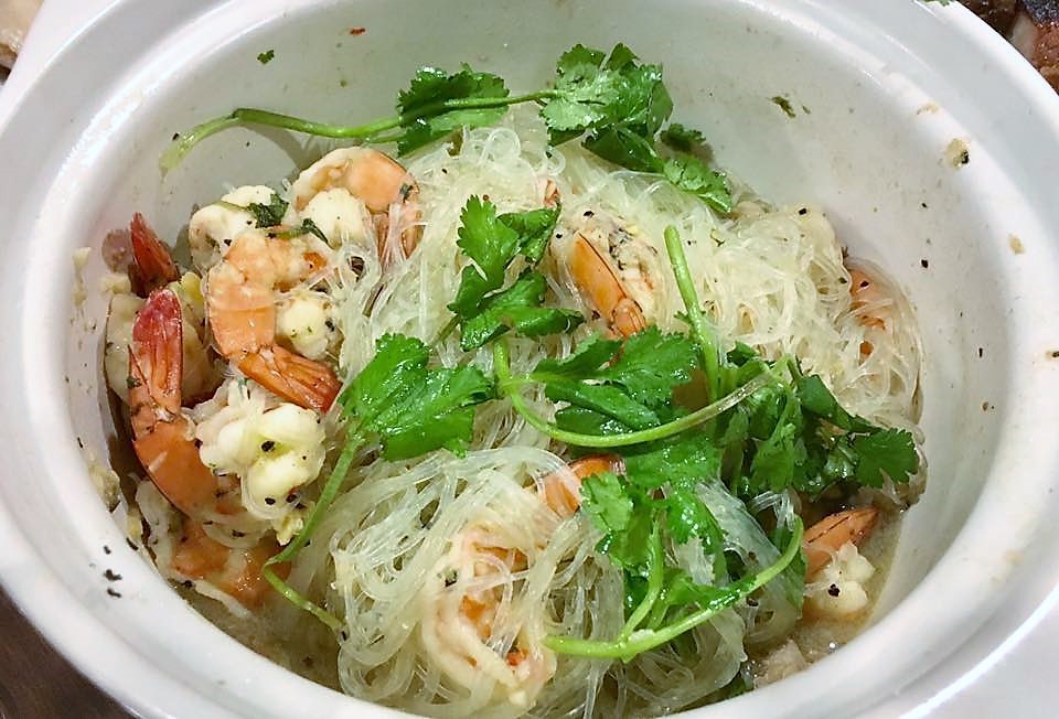 when serving boiled the stock, added in 3 rools of tanhoon, off fire, added back the prawns, tossed thoroughly, garnished with coriander & bring to table covered. voila!