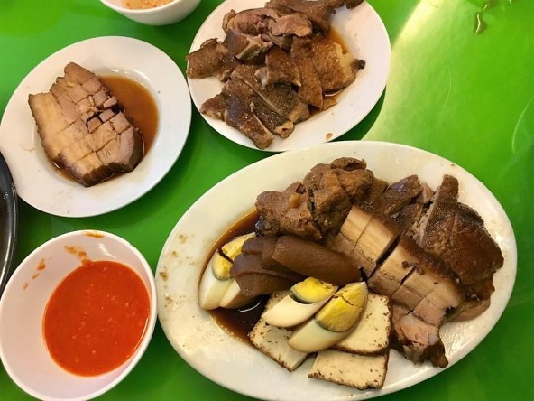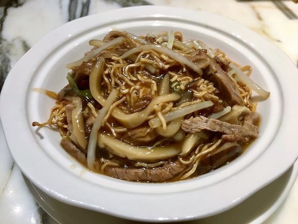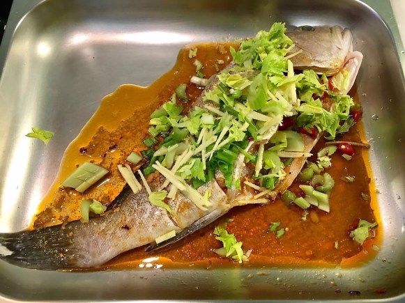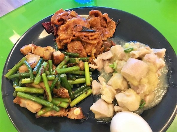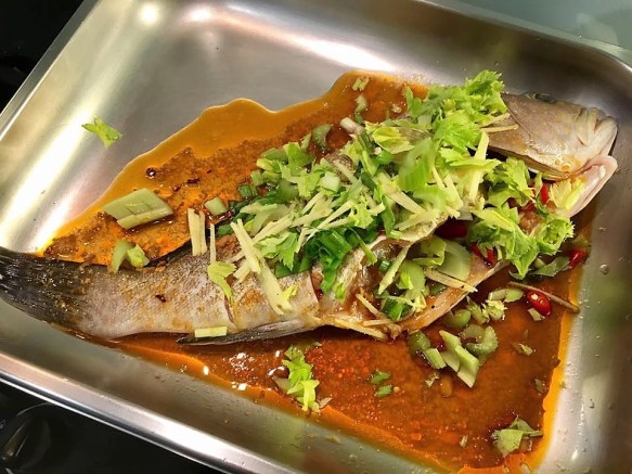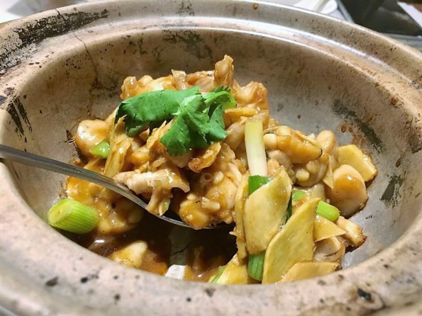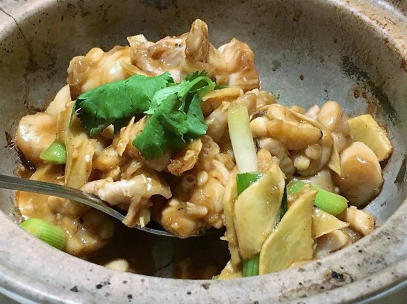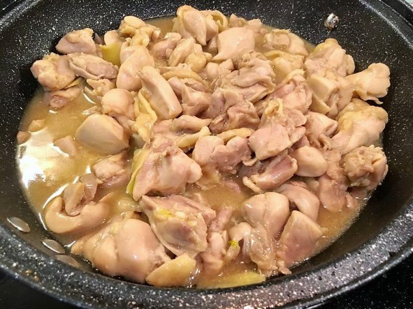in the morning, i fry sliced ginger, then added chopped garlic & the chicken pieces to brown a bit, then added the marinade, covered the wok pan for about 4mins medium low fire.