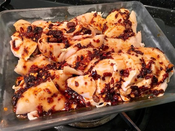 - mix 2 tbsp mala chilli oil, 2tsp sugar, 1.5tbsp fish sauce, 1 tbsp sesame oil, 1tbsp olive oil & taste to liking, then add to the chicken.
