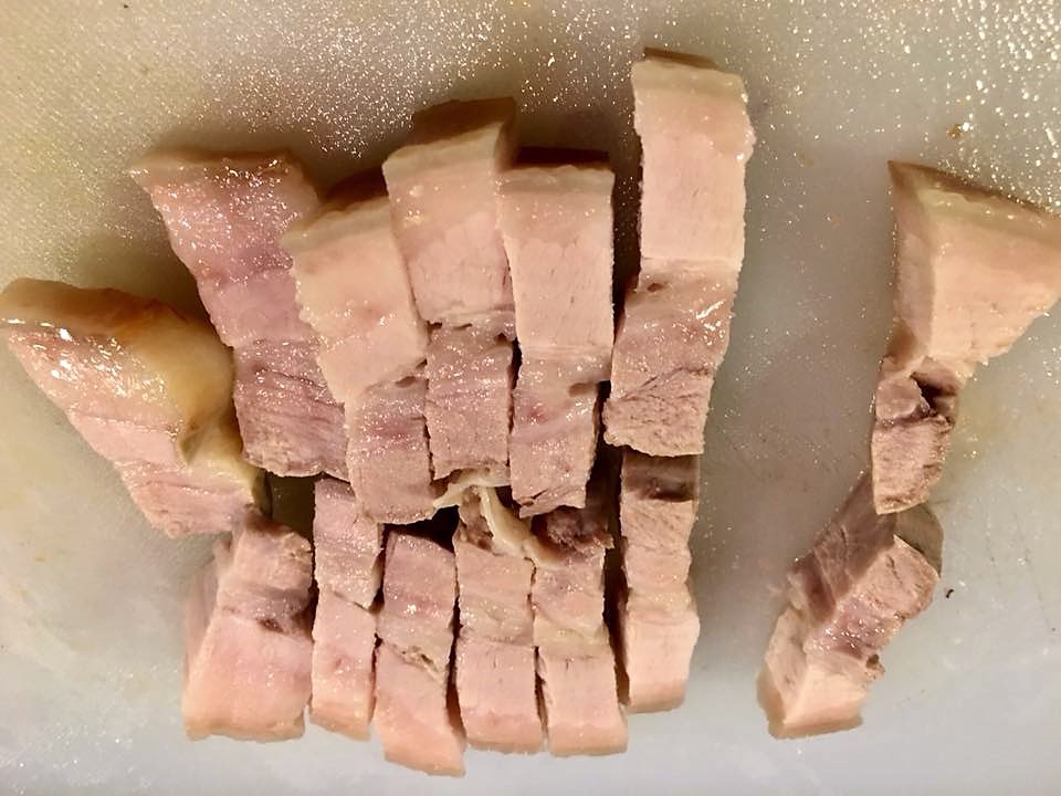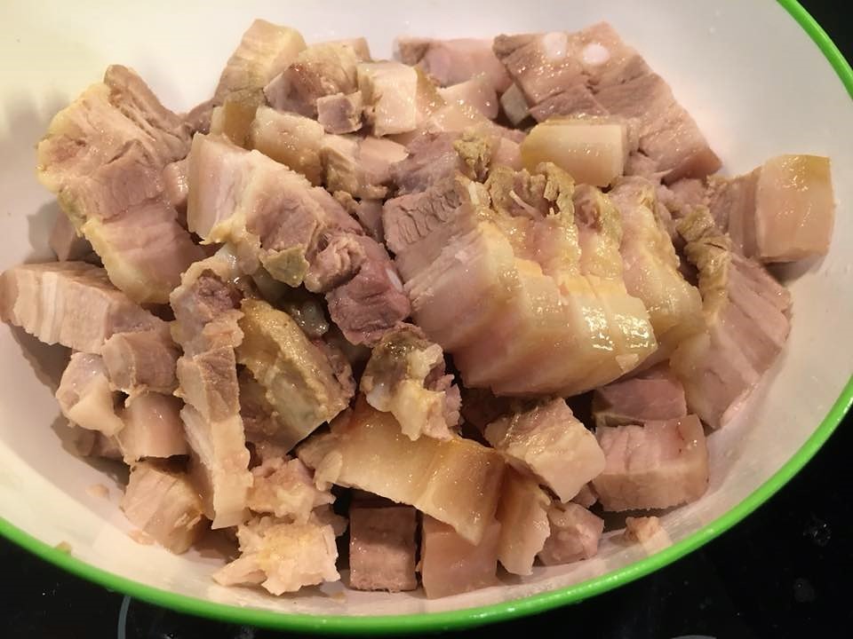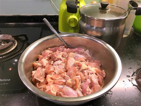 i bought 2kg frozen boneless chicken thigh from sheng shiong, defrosted, cut & cleaned with salt & placed in a colander in the fridge to dry the evening before.