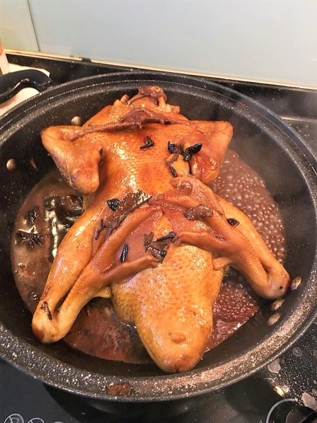 this was easy to make using tai hua braising sauce, adding cinnamon bark, star anise, cloves, and whole bulb of garlic cloves.