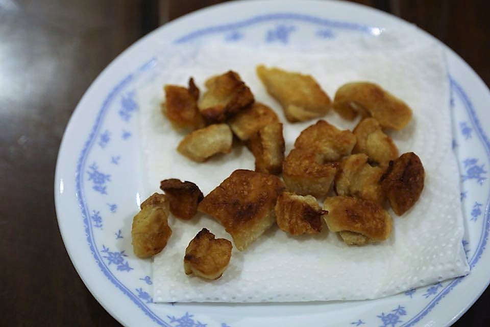 this reproduced my favourite prepartion (by hk street chun kee clumpy black bean sauce song fish head 松鱼头) at commonwealth crescent food centre. & i topped the dish with lar pok – crispy lard.