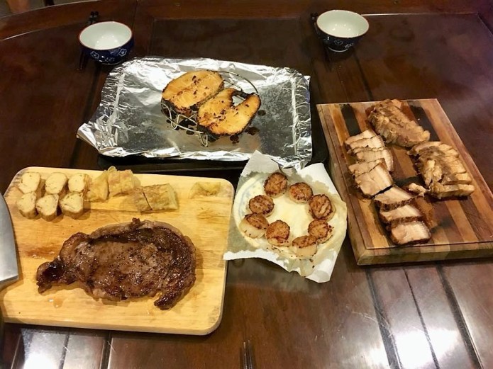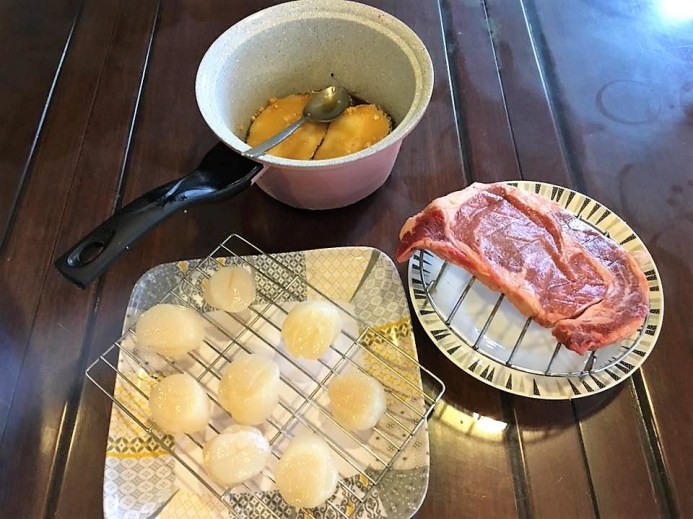 i planned scallops, cod, belly pork & beef & also tamago.
