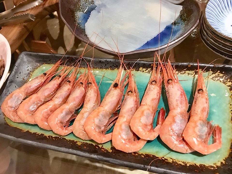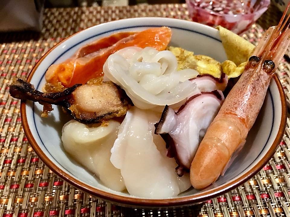 topped up pan-seared hokkaido scallops, grilled chicken thighs, steamed prawns, poached broco