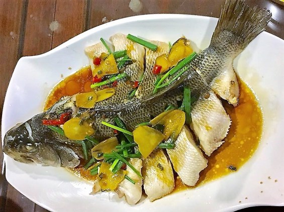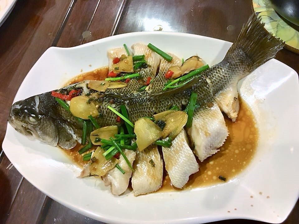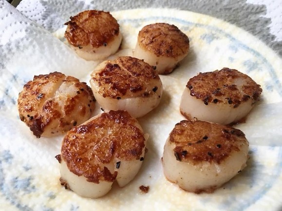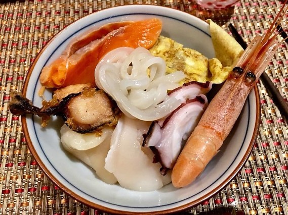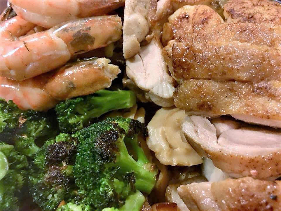 topped up pan-seared hokkaido scallops, grilled chicken thighs, steamed prawns, poached brocoli