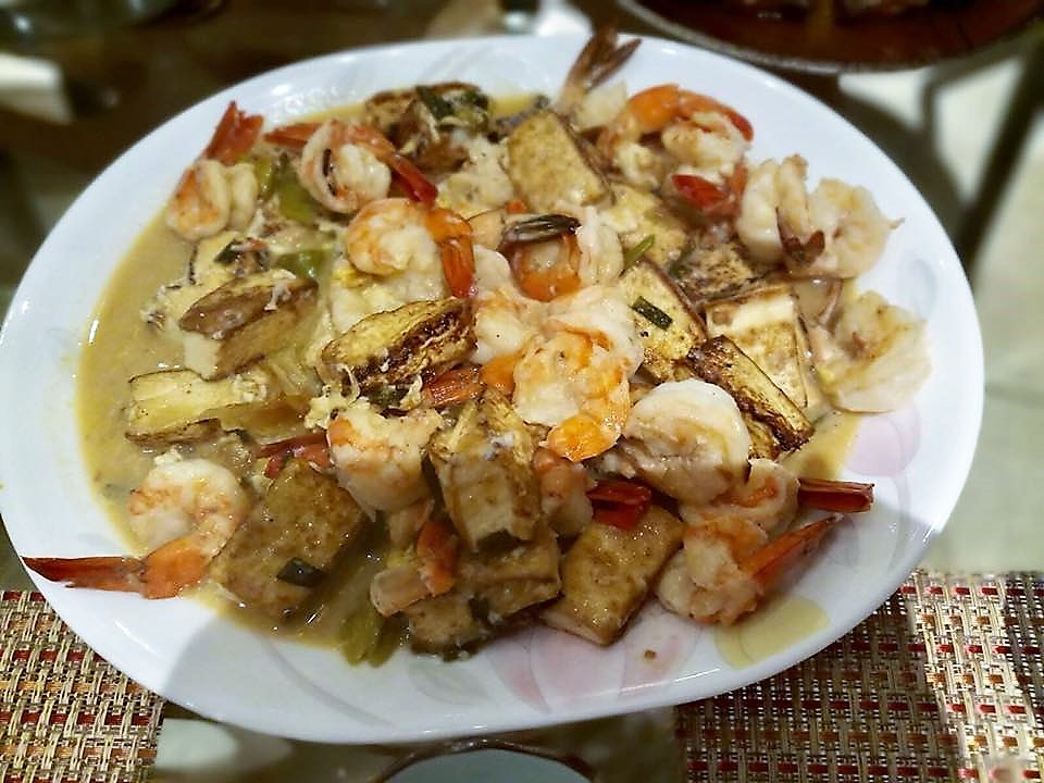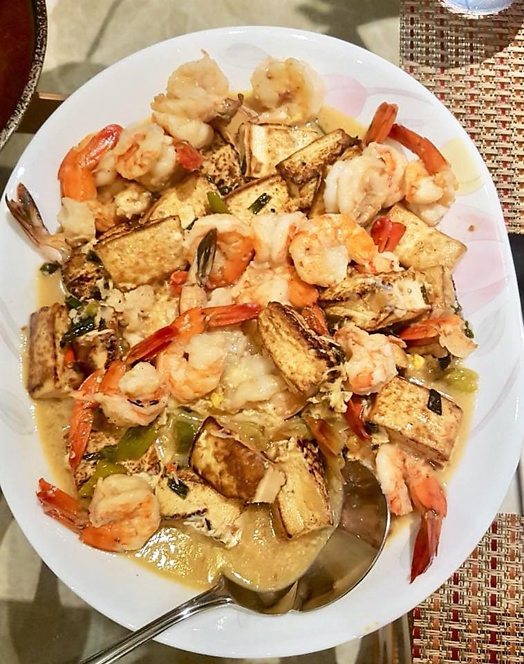 this evening’s tofu prawns stock & fried tofu were good, well infused.