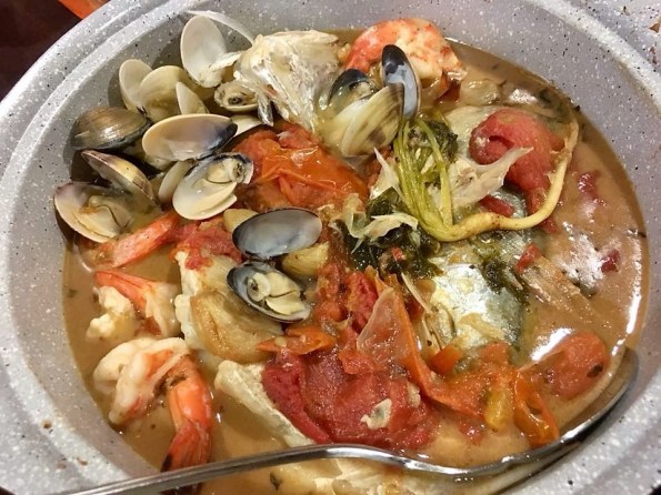 - croatian brodet (Croatian style bouillabaisse) fish stew (treadfin head, whole seabream, prawns, littleneck clams aka la la)