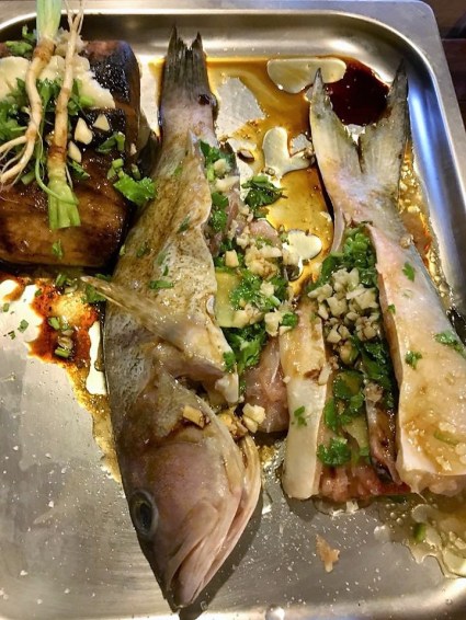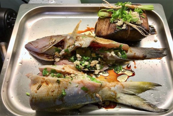stuffed with sliced ginger, chopped scallions & garlic, a bit of salt and some coriander, oven grilled at 250degC for 9mins with 2-3tbsp light soy sauce & 2 tbsp olive oil. then drizzle 1 tbsp lemon juice.
