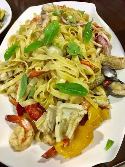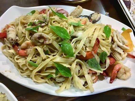 when serving i added the prawns & littleneck clams, then squid & covered, the added tagliatelle & tossed. wife felt that the tagliatelle was not al dente enough. otherwise the pasta was tasty & prawns & squid & clams were just right, not overcooked..