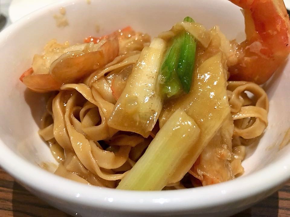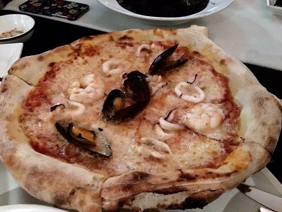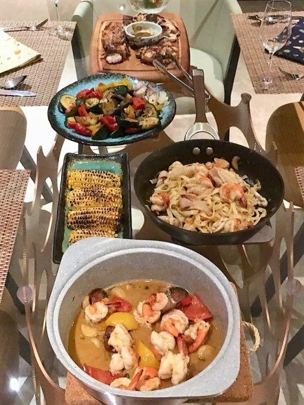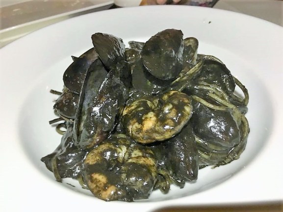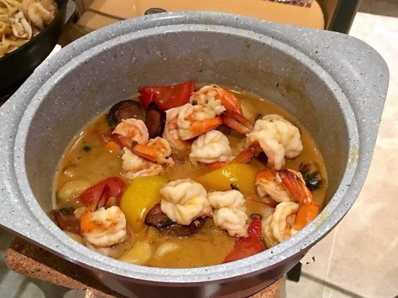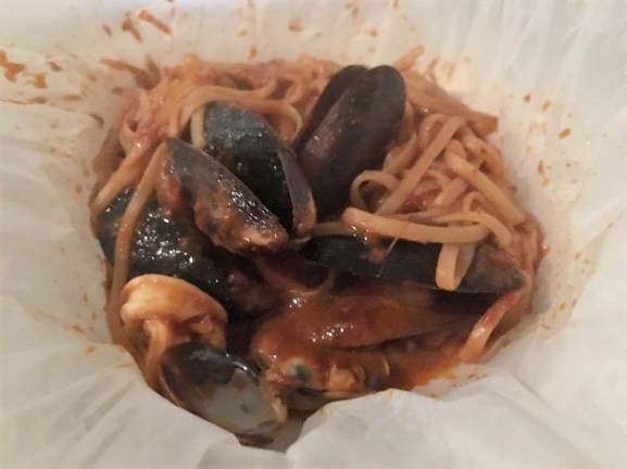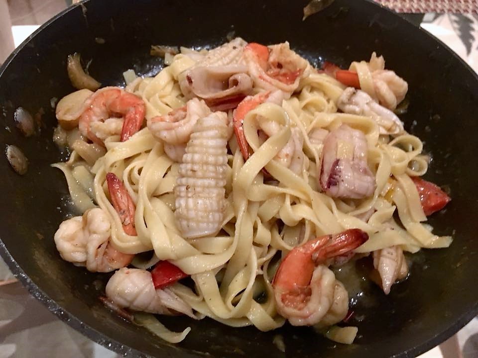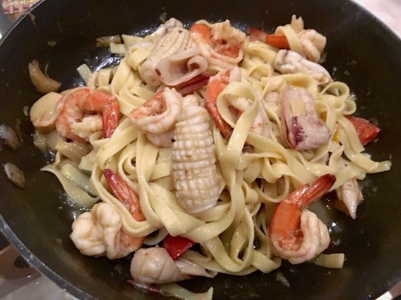 when serving i added the prawns & littleneck clams, then squid & covered, the added tagliatelle & tossed. wife felt that the tagliatelle was not al dente enough. otherwise the pasta was tasty & prawns & squid & clams were just right, not overcooked..