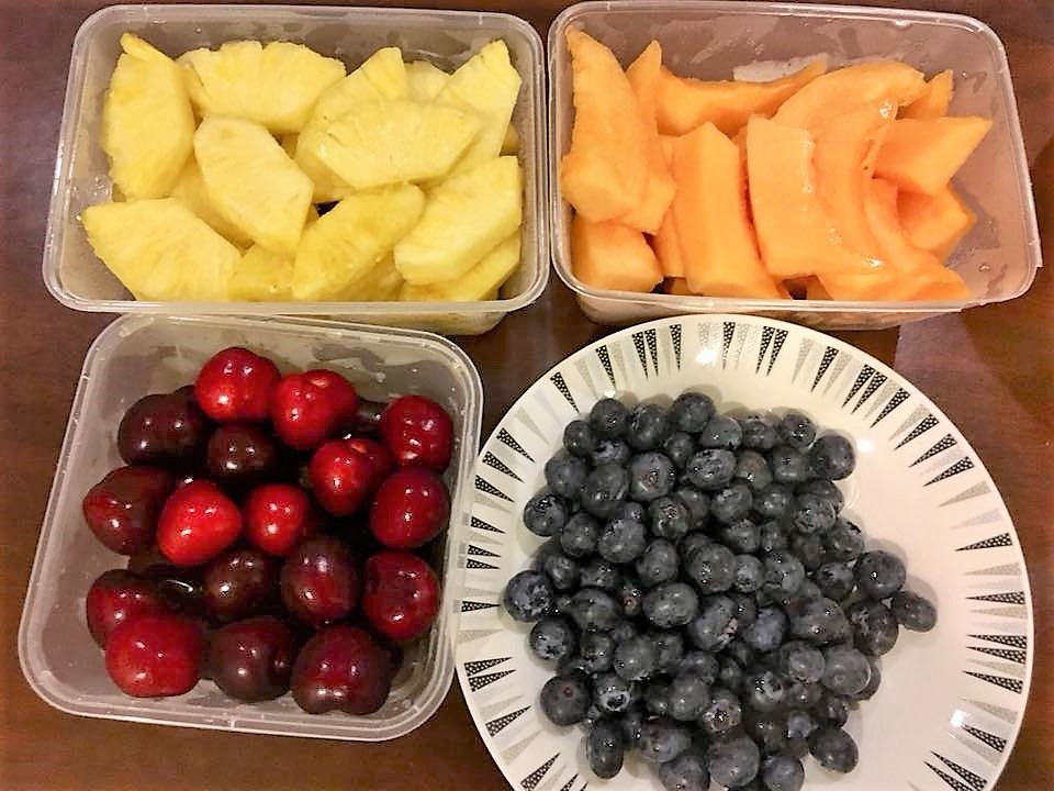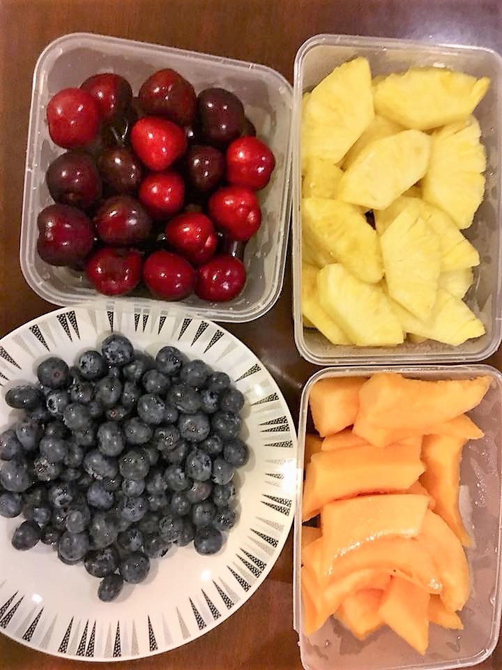 fruits – cut pineapples, rock melons, cherries & blueberries