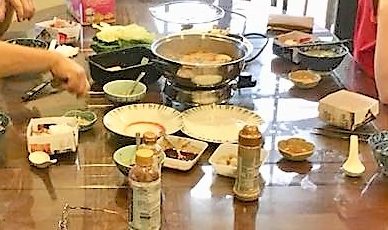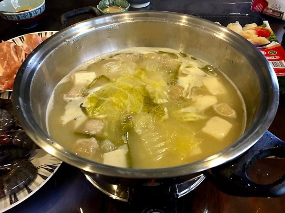 i fried red onions, chopped scallions, sliced ginger, whole coriander till fragrant then added chopped garlic. i used intense chicken stock, so broth was very tasty. the fish i cooked for about 4-5mins. when serving i heat up covered, added the prawns & the littleneck clams (la la) to cook, then served.