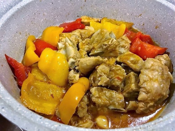 i made also spicy bean sauce pork softbones with yellow & red peppers.