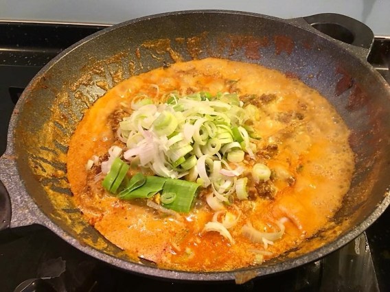 fried cut chilli, cut red onions, cut spring onions, sliced ginger in 1tbsp oil. then i added 2 stalks coriander & 2tsp chopped garlic.